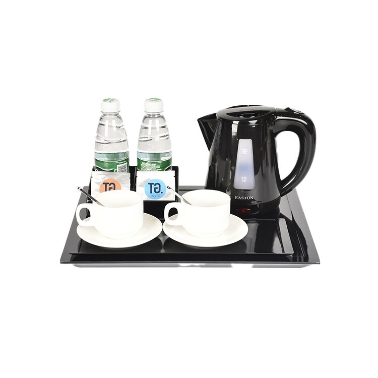Couleur noire trois plateaux de mélamine plus une bouilloire ES6332 Plateau principal / ES6333 SEVICE TRAY / ES6334 SACHET TRAY plus ES1018 Plastic Electric Kettle pour être un ensemble complet La bouilloire peut être fixée sur le plateau, a l'air bien rangé et facile à nettoyer